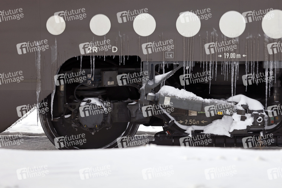 Ein ICE fährt bei Schnee in den HBF Hamm, an seinen Achsen hängen Eiszapfen. Bei Schnee und Eis stehen bei der Deutschen Bahn Spezialtechnik und zehntausende Einsatzkräfte bundesweit bereit, um Bahnsteige und Gleise schnellstmöglich freizuräumen sowie Züge und Loks winterfest zu machen. (Themenbild, Symbolbild) Hamm, 16.02.2021