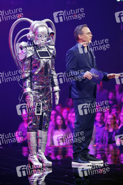 Der Roboter und Matthias Opdenhövel in der 1. Live Show der 2. Staffel 'The Masked Singer' 2020 in den MMC Studios Köln-Ossendorf. Köln, 10.03.2020