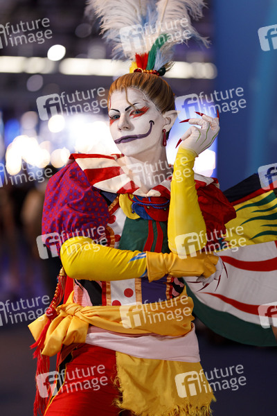 Rollenspiel, Kostüm, Harlekin, Hofnarr, Schalk, Narr, Barde, Clown, Faxenmacher, Schelm, Player, Bildschirmlicht, Spielesucht, Digitalisierung, Reizüberflutung, Spiele-Messe, Gaming, Gaming-Industrie, Spieleindustrie, Spielemesse, Gamingindustrie, Zocken, Daddeln, Games, Game, Spiele, PC-Spiele, Computerspiele, Konsolen, Konsolenspiele, Videospiele, Fair, Event, Gamer, Unterhaltungselektronik, Software, Hardware, europäische Leitmesse für digitale Spielekultur, internationale Gaming-Community, Gamescom Congress 2019, Virtual Reality, Browsergames, Spieletrends, Symbolfoto, Symbolbild