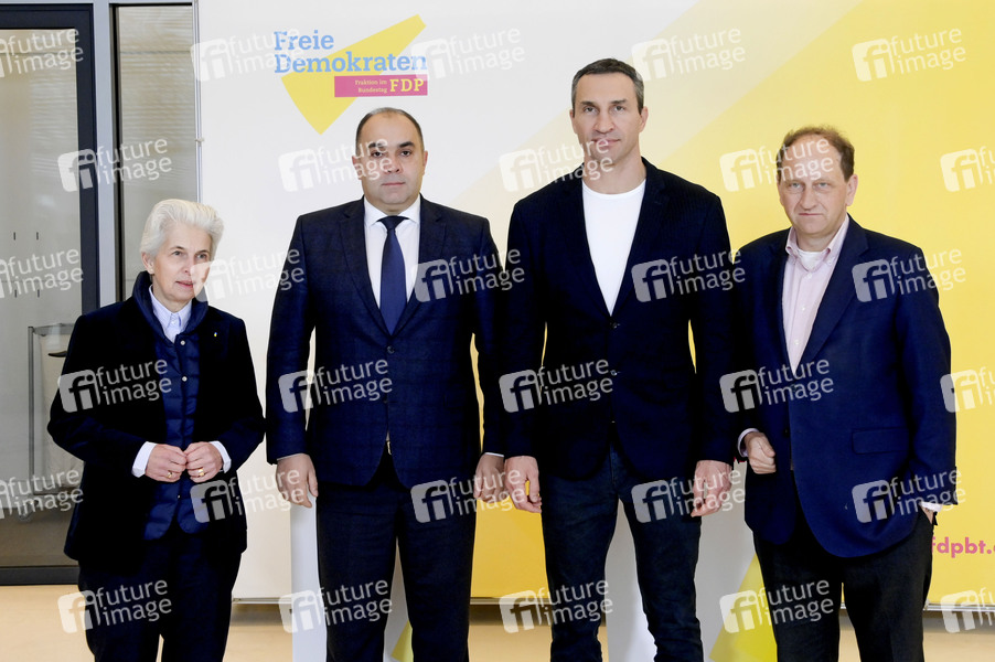Marie-Agnes Strack-Zimmermann, Bogdan Balasynovych, Wladimir Klitschko und Alexander Graf Lambsdorff bei einem Fototermin vor Beginn der Sitzung des Arbeitskreises 'Freiheit und Menschenrechte weltweit' der FDP-Fraktion auf der Fraktionsebene im Bundestag. Berlin, 29.11.2022