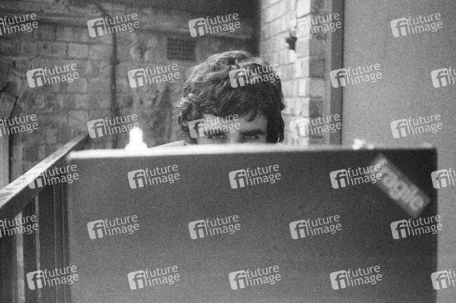 Jaz Coleman von Killing Joke bei einem exklusiven Photoshooting im Hof eines Tonstudios. London, 06.08.1983