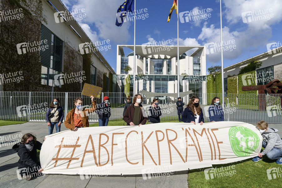 Mit vier Kundgebungen zwischen Kanzleramt und Bundestag protestieren Aktivisten von Campact, Fridays for Future, Ende Gelände, die Interventionistische Linke, Naturfreunde und die Umweltschutzorganisation Greenpeace vor dem Autogipfel im Berliner Kanzleramt gegen eine von den Autokonzernen geforderte Autoprämie. Diese neue Abwrackprämie soll im Rahmen einer Telefonkonferenz zwischen Bundeskanzlerin Merkel mit Vertretern der Automobilindustrie beschlossen werden. Berlin, 05.05.2020