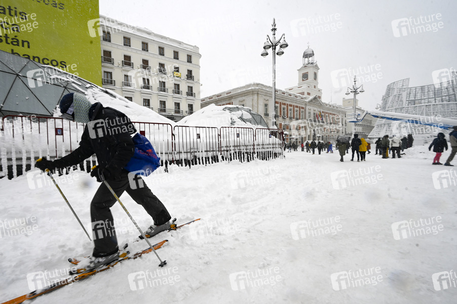 Skifahrer auf dem Puerta del Sol - Das Sturmtief Filomena sorgt in der Region Madrid und anderen Teilen Spaniens mit starken Schneefällen für Chaos. Die Hauptstadt Madrid wurde durch historisch heftigen Schneefall lahmgelegt. Seit 50 Jahren hat es nicht so geschneit. Der Verkehr ist in weiten Teilen des Landes zusammengebrochen. Madrid, 09.01.2021