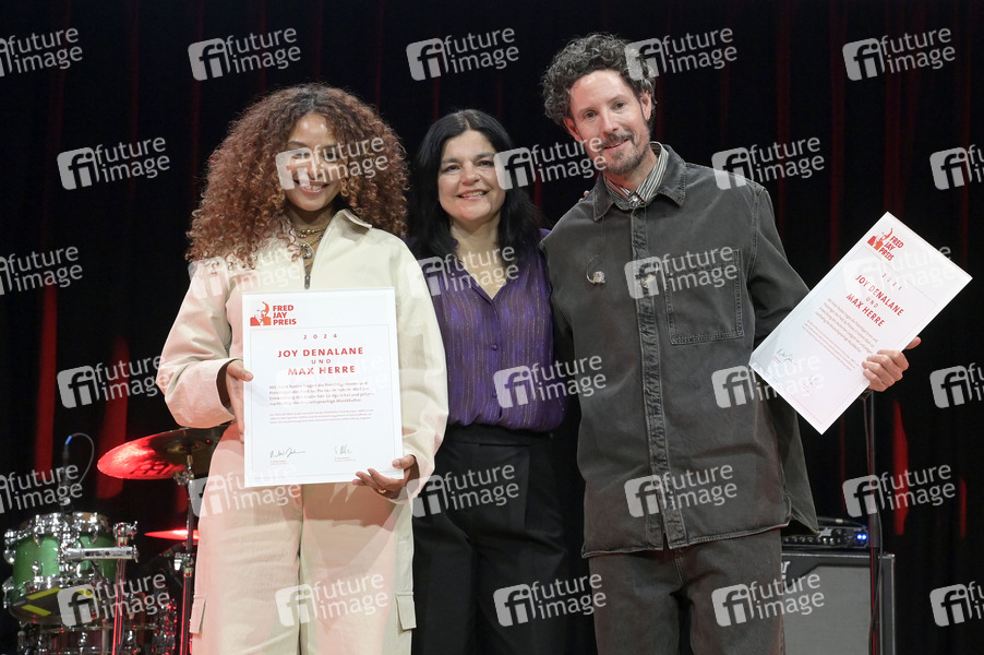 Joy Denalane, Jasmin Tabatabai und Max Herre bei der Verleihung des Fred Jay Preises 2024 im bcc Berlin Congress Center. Berlin, 14.05.2024