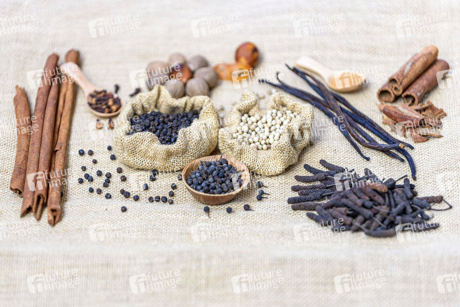Gewürze, Gewürz, Kochen, Küche, Muskat, Muskatblüte, Zimt, Zimtkassie, Vanille, Nelken, Nelke, schwarzer Pfeffer, weißer Pfeffer, Kubeben Pfeffer, langer Pfeffer, Pfefferkörner, Piper Nigrum, Küche, Aroma, Aromatisch, Gastronomie, Indonesien, Organic, Spices, Sulawesi, Symbolbild, Symbolfoto