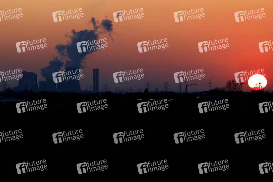 Das Kohlekraftwerk Niederaußem und umliegende Stromleitungen zeichnen sich gegen die untergehende Sonne ab. Aus Sicht von Brandenburgs Ministerpräsident Dietmar Woidke (SPD) muss nach dem Angriff Russlands auf die Ukraine der auf 2030 vorgezogene Kohleausstieg neu diskutiert werden. Bergheim, 05.03.2022