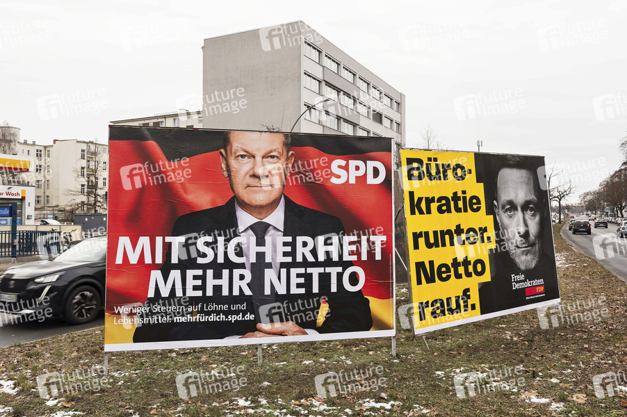 Wahlplakate zur Bundestagswahl mit Motiven SPD Olaf Scholz sowie FDP Christian Lindner. Berlin, 14.01.2025