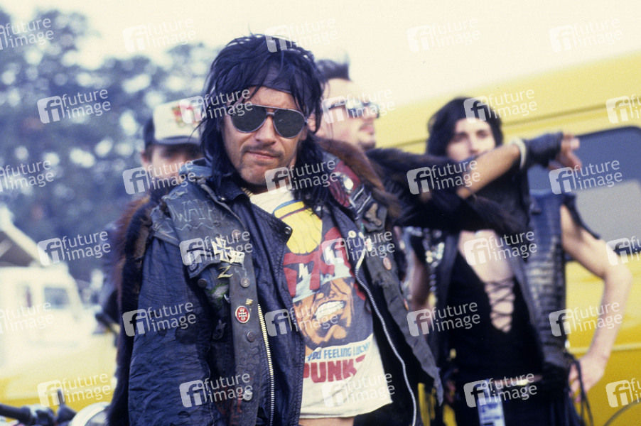 Mark 'Zodiac Mindwarp' Manning von Zodiac Mindwarp and the Love Reaction auf dem Reading Rock Festival 1986 an der Richfield Avenue. Reading, 24..08.1986