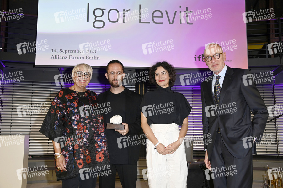 Claudia Roth, Preisträger Igor Levit, Anna-Lena von Hodenberg und Ulrich Raulff bei der Verleihung des ifa-Preises 2021 im Allianzforum am Pariser Platz. Berlin, 14.09.2021