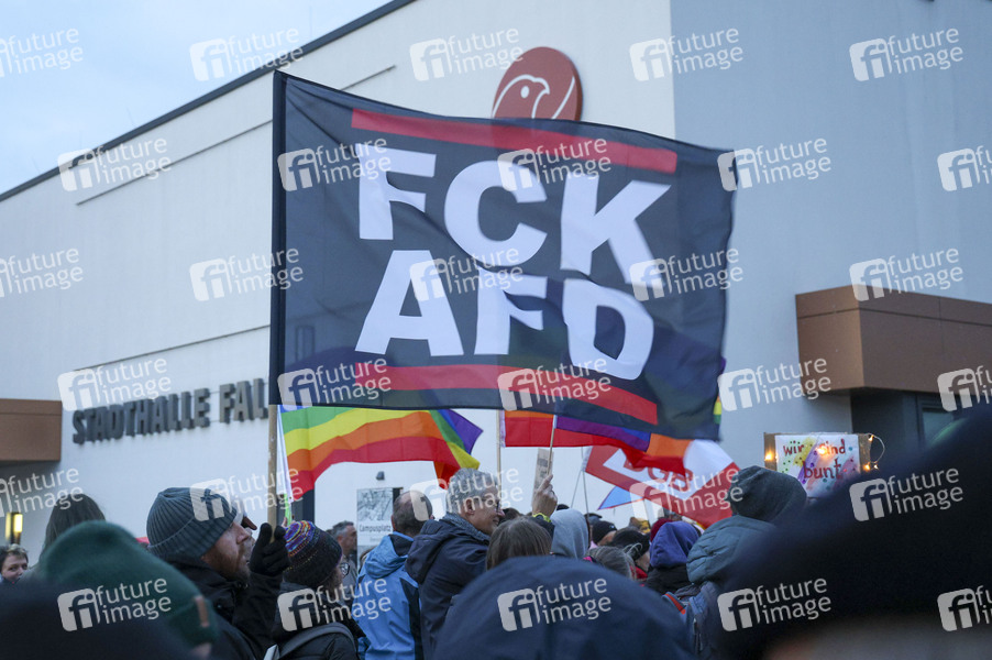 Demo vor der Stadthalle Falkensee. In einem Antrag forderte die AfD Falkensee ein Verbot für das Hissen der Regenbogenflagge an öffentlichen Plätzen und Gebäuden der Stadt. Ein breites Bündnis aus Vereinen, Jugendgruppen, Kirchenvertretern und Initiativen reagierte darauf mit Widerstand. Mit deutlicher Mehrheit haben die Stadtverordneten den Antrag der AfD abgelehnt. Falkensee, 29.01.2025