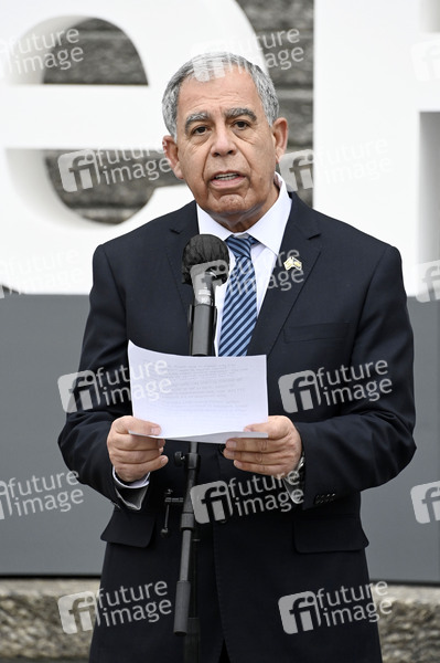 Mickey Levy bei den Pressestatements von Wolfgang Sobotka, Mickey Levy und Bärbel Bas am Schriftzug #WeRemember zur Erinnerung an die Millionen im Nationalsozialismus ermordeten Juden vor dem Reichstagsgebäude. Berlin, 25.01.2022