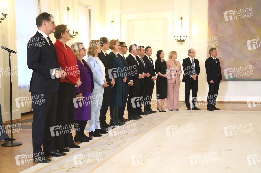 Wolfgang Schmidt, Klara Geywitz, Svenja Schulze, Steffi Lemke, Karl Lauterbach, Lisa Paus, Cem Özdemir, Boris Pistorius, Hubertus Heil, Volker Wissing, Annalena Baerbock, Nancy Faeser, Jörg Kukies und Robert Habeck bei der Entlassung der Bundesregierung des 20. Deutschen Bundestages durch den Bundespräsidenten im Schloss Bellevue. Berlin, 25.03.2025