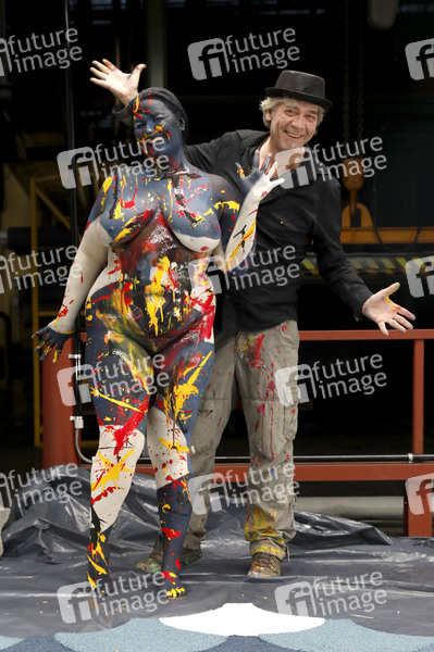 Bodyart-Künstler Jörg Düsterwald realisiert zum Thema 'Vielfältigkeit' mit verschiedenen Fotomodell-Typen eine Kunstwerk-Serie. In den Produktionshallen des kooperierenden Unternehmens Vorwerk flooring in Hameln hat er das Plus-Size-Model Nisi passend zum gesponserten Bodenbelag mit einem Bodypainting versehen und anschließend flüssige Farbspuren aufgetragen.