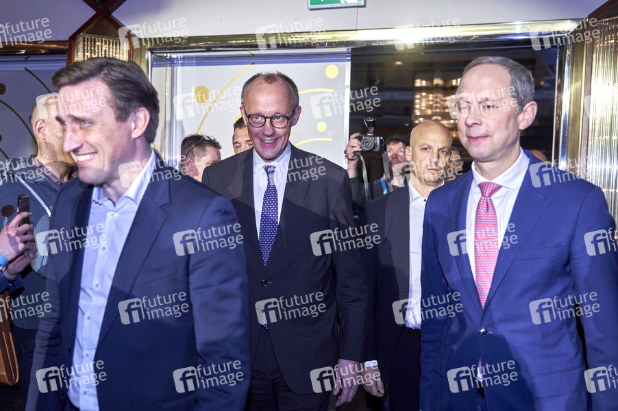 Sebastian Lechner, Friedrich Merz und Hendrik Hoppenstedt bei einer Wahlkampfveranstaltung der CDU zum Bundestagswahlkampf 2025 im Maritim Hotel Airport. Langenhagen, 18.01.2025