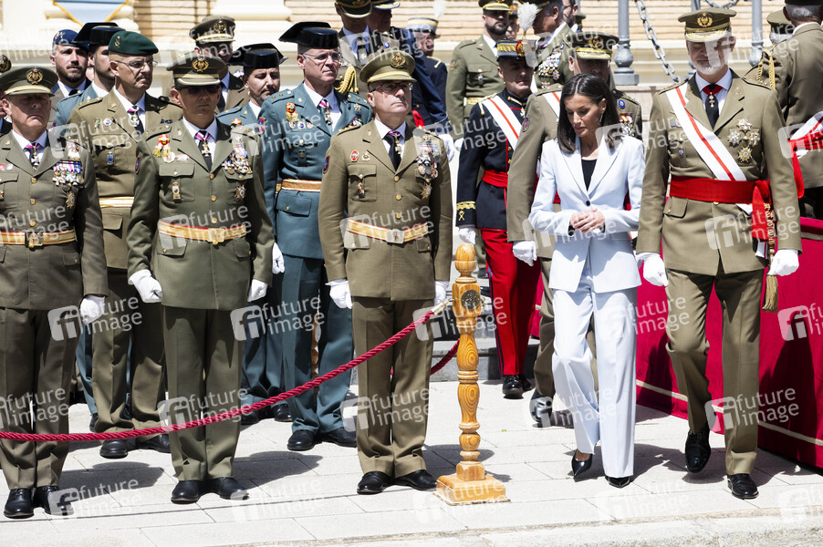 Königin Letizia von Spanien und König Felipe VI. von Spanien beim 40. Jahrestag der Vereidigung des Königs in der spanischen Armee beim 44. Jahrgang der Academia General Militar de Zaragoza. Saragossa, 04.05.2024