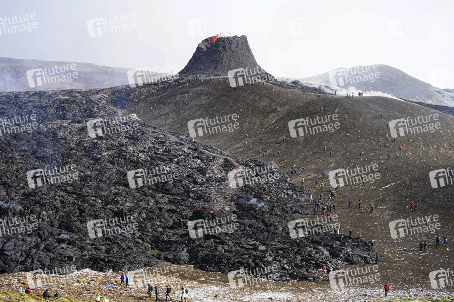 Spalteneruption am Berg Fagradalsfjall auf der Halbinsel Reykjanes im Südwesten Islands. Die Lava fließt in das Tal Geldingadalur. Besucher können das Gebiet bereten. Die Sicherheit wird durch Rettungsteams, Wissenschaftler und Polizei gewährleistet, die das Gebiet bei Gefahr sperren. Grindavik, 23.03.2021