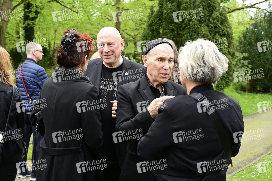 Manfred Hennig und Georgi Gogow von City am Grab des verstorbenen Gitarristen von City, Fritz Puppel, auf dem Friedhof Baumschulenweg. Berlin, 10.04.2024