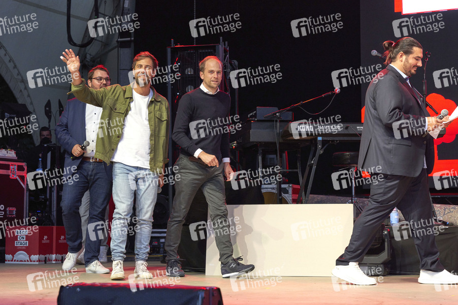 Max Giesinger, Raoul Roßmann und Nico Röger bei der Scheckübergabe vor dem Max Giesinger Charitykonzert im Rahmen der Konzertreihe 'Back on Stage' auf der Gilde Parkbühne. Hannover, 13.09.2021