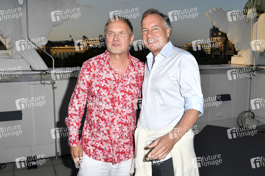 Uwe Ochsenknecht und Nico Hofmann beim Vorab-Empfang UFA Filmnächte 2019 auf der Dachterrasse der Bertelsmann-Repräsentanz. Berlin, 21.08.2019