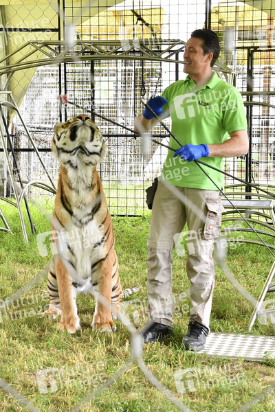 Alexander Lacey mit Tiger beim Presserundgang auf der Circus Krone-Farm. Weßling, 29.06.2020