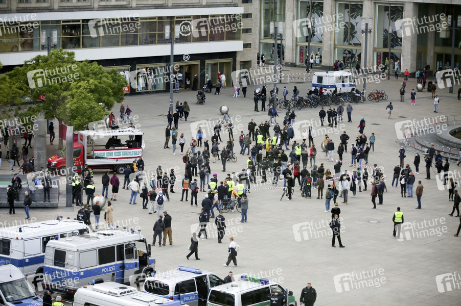 Auf dem Alexanderplatz haben sich einige Demonstranten versammelt, um gegen Verschwörungstheoretiker zu demonstrieren. Die Polizei hat den Platz abgeriegelt und kontroliert jeden, der ihn betreten will. Am Samstag sind rund um den Rosa-Luxemburg-Platz mehrere 'Hygienedemos' und Gegenproteste geplant. Am Alexanderplatz sollen ab 14 Uhr insgesamt zehn Kundgebungen starten. Berlin, 16.05.2020