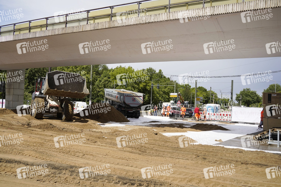 Beginn vom Abriss der maroden Brücke an der Wuhlheide (Oberschöneweide). Die kaputte Brücke soll schnellstmöglich entfernt werden mit dem Ziel, die Freigabe der blockieren Straßenbahntrasse und Wiederherstellung des Fuß- und Radverkehrs zwischen Treskowallee und Edisonstraße möglichst bis zum 30. Mai. Berlin, 23.05.2025