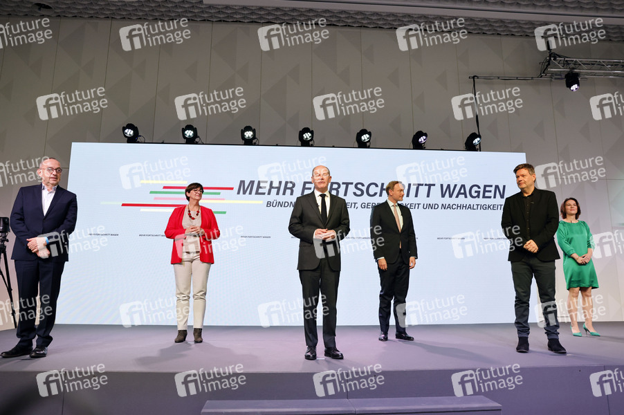 Norbert Walter-Borjans, Saskia Esken, Olaf Scholz, Christian Lindner, Robert Habeck und Annalena Baerbock beim Pressetermin zur Unterzeichnung des Koalitionsvertrages zwischen SPD, Bündnis 90/Die Grünen und FDP im Futurium. Berlin, 07.12.2021