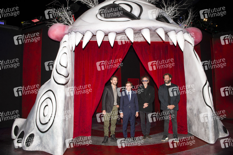 Paco Leon, Jose Luis Martinez-Almeida, Tim Burton und Inaki Fernandez bei der Eröffnung der Ausstellung 'Tim Burton - El Laberinto' im Espacio Ibercaja Delicias. Madrid, 28.09.2022