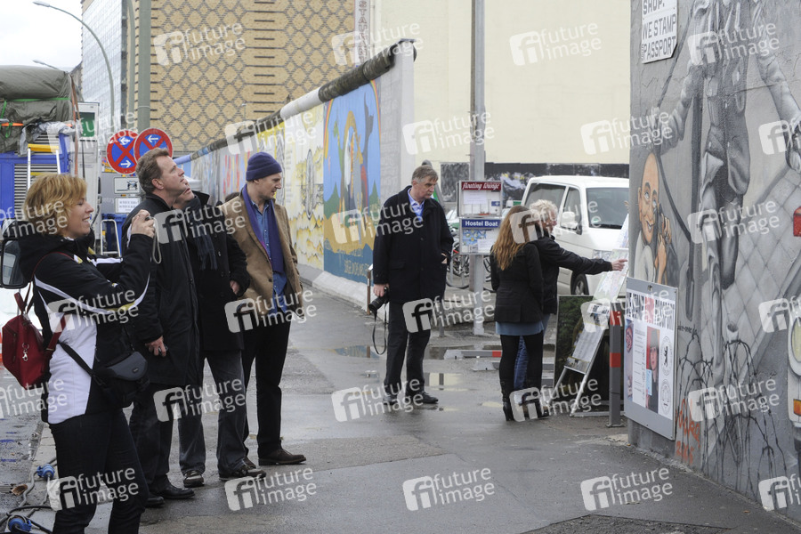 Liam Neeson besucht die Berliner Mauer an der East Side Gallery während einer Drehpause zu seinem Thriller 'Unknown Identity'