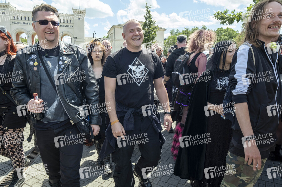 Teilnehmer des 28. Wave-Gotik-Treffens beim nicht ganz ernst gemeinten Marsch für Satan anlässlich des zeitgleichen Umzugs evangelikaler Christen unter dem Motto Marrsch für Jesus durch die Innenstadt. Leipzig, 08.06.2019