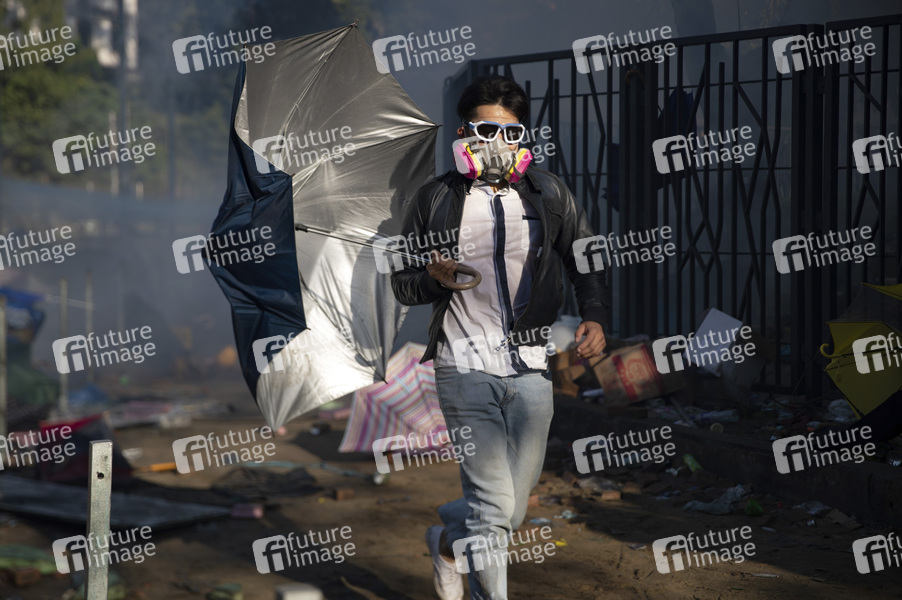 Flucht vor Tränengas - Belagerung an der Polytechnischen Universität. Die Polizei umstellt den Campus der Universität, nachdem Demonstranten den Cross-Harbor-Tunnel und die Hauptstraße außerhalb des Campus blockiert haben. Hongkong protestiert seit fünf Monaten ununterbrochen. Am Montag, dem 11. November 2019, begann ein Streik in der ganzen Stadt, der Teile von Hongkong zum Erliegen brachte, als MTR-Stationen geschlossen und mehrere Straßensperren errichtet wurden. Hongkong, 18.11.2019