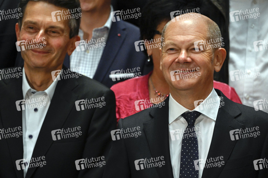 Rolf Mützenich und Olaf Scholz beim Bildtermin mit der neuen SPD Fraktion auf der Fraktionsebene im Reichstagsgebäude. Berlin, 29.09.2021