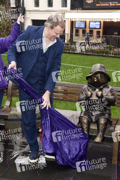 Hugh Bonneville mit Paddington Bär Statue