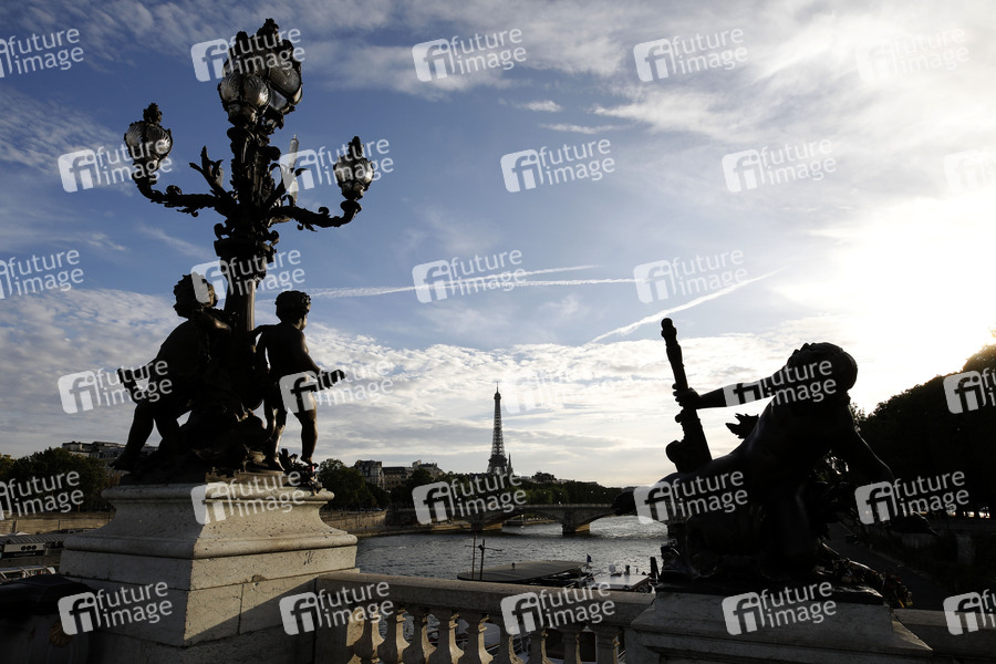 Der Pont Alexandre III ist eine im Stil des Neobarocks errichtete Brücke über die Seine in Paris. Er gilt als eindrucksvollste und auch kühnste Bogenbrücke ihrer Epoche und ist mit zahlreichen dekorativen Elementen wie Löwen, vergoldeten Figuren oder Pylonen versehen. Paris, 29.07.2019