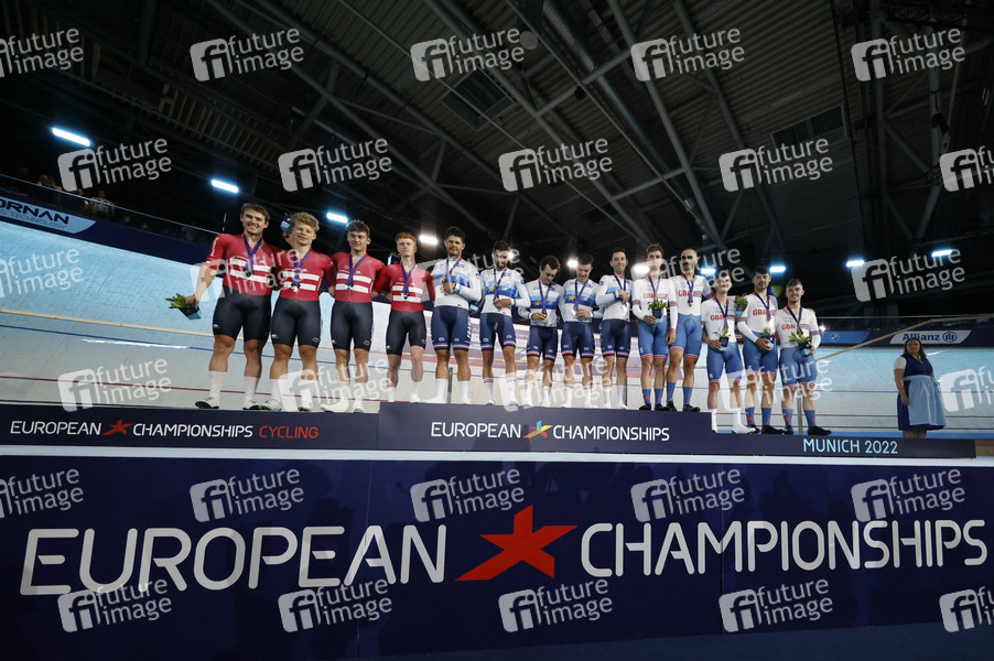 Siegerehrung Mannschaftsverfolgung Männer bei den European Championships 2022 im Bahnradsport in der Messe München. München, 12.08.2022