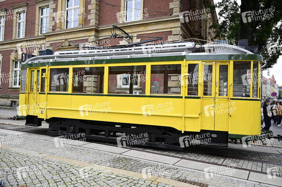 Historischer Straßenbahn Triebwagen Nr. 23, Baujahr: 1928, Hersteller: WUMAG Görlitz, auf der Ausstellungsmeile rund um Forschung und Praxis zur Zukunft der Mobilität anlässlich der Europäischen Mobilitätswoche auf dem Postplatz. Görlitz, 16.09.2024