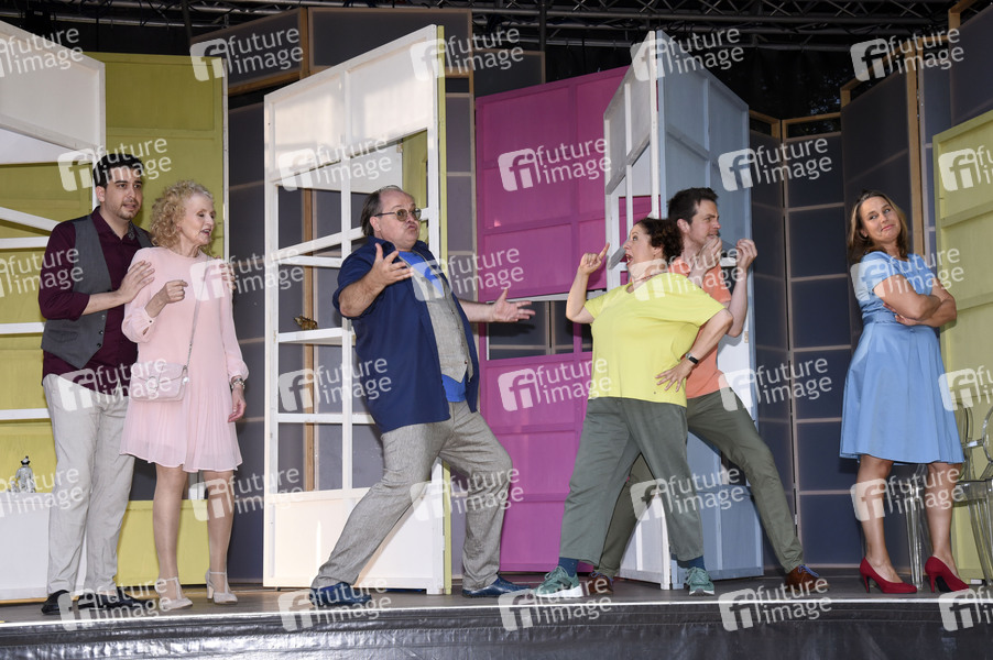 David Daria, Kerstin Fernström, Markus Majowski, Franziska Traub, Sebastian Waldemer und Marie Theres Relin bei der Fotoprobe zum Theaterstück 'Ungeheuer heiß' auf der Freiluftbühne im Gastgarten Siebenbrunn. München, 27.07.2021
