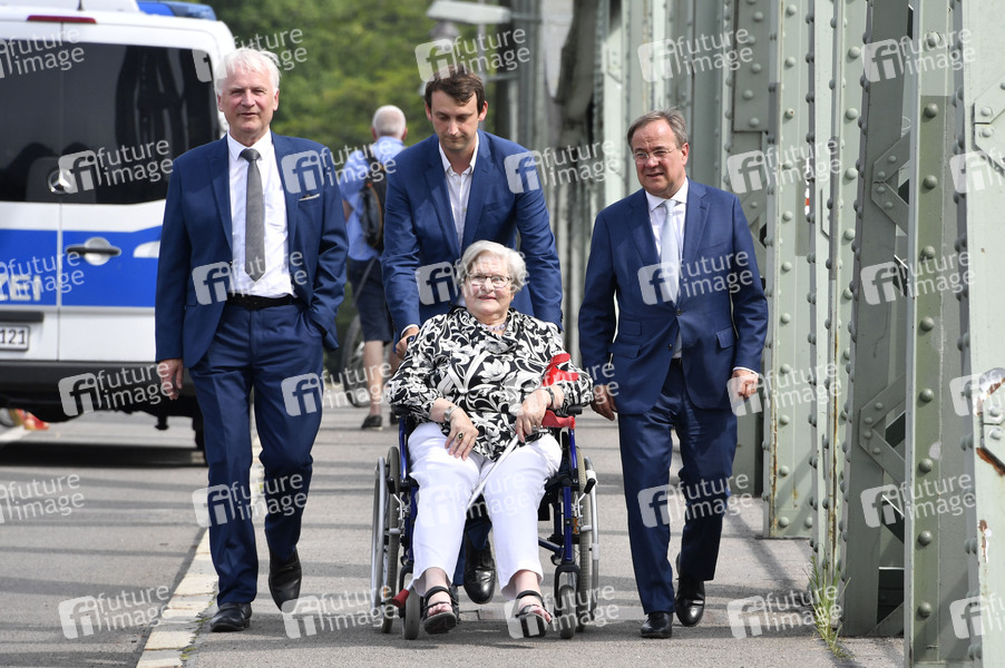 Dieter Dombrowski, Maria von Pawelsz-Wolf und Armin Laschet bei einer Gedenkveranstaltung zum 60. Jahrestag des Baus der Berliner Mauer an der Glienicker Brücke. Potsdam, 13.08.2021