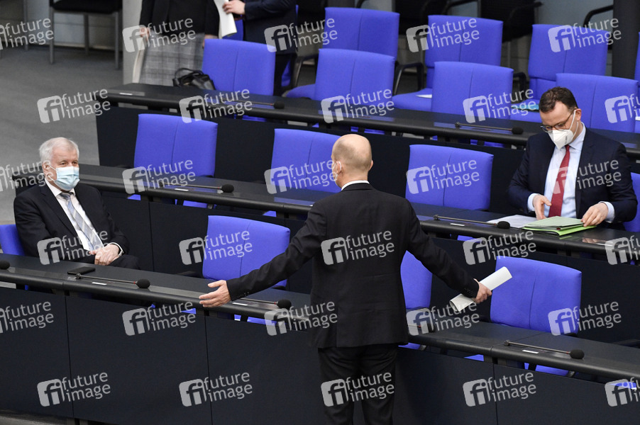 Horst Seehofer, Ralph Brinkhaus und Jens Spahn in der 223. Sitzung des Deutschen Bundestages im Reichstagsgebäude. Berlin, 21.04.2021