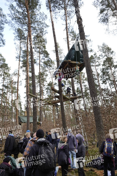 Das Protestcamp von Umweltaktivisten in Grünheide richtet sich gegen die Erweiterungspläne des Tesla-Werks. Die Aktivisten werfen Tesla vor, Umweltverstöße zu begehen, Trinkwasser zu gefährden und Abwasser-Grenzwerten zu überschreiten. Seit Donnerstag halten die Aktivisten einen Teil des Landeswaldes besetzt, den Tesla im Falle einer Erweiterung seines Geländes roden will. Sie haben um die zehn Baumhäuser in mehreren Metern Höhe errichtet und kündigten an, möglichst lange ausharren zu wollen. Auch die Bürgerinitiative Grünheide spricht sich gegen die Erweiterungspläne aus und zeigt sich mit den Besetzern solidarisch. Grünheide, 02.03.2024
