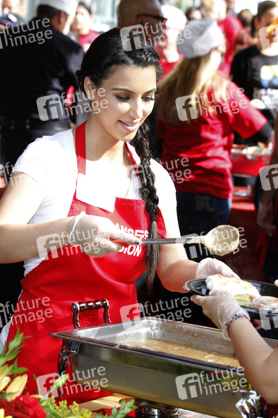 Prominente servieren Obdachlosen eine traditionelle Thanksgiving Mahlzeit zum 75. Geburtstag der Los Angeles Mission, Los Angeles, Kalifornien