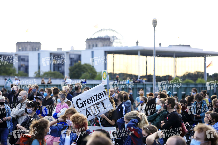 Tausende Demonstranten fordern die sofortige Aufnahme von Flüchtlingen aus dem von einem Grossbrand zerstörten griechischen Flüchtlingslager Moria (Lesbos) bei einer Demonstration unter dem Motto 'Evakuiert die Lager, denn #WirHabenPlatz' vom Bündnis 'Seebrücke' am Hauptbahnhof. Berlin, 09.09.2020
