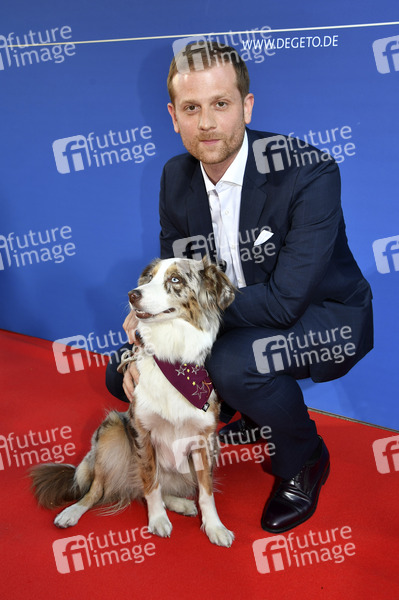 Christoph Schechinger mit Filmhund Käthe beim ARD Degeto Empfang auf dem 37. Filmfest München 2019 im Kaisergarten. München, 28.06.2019