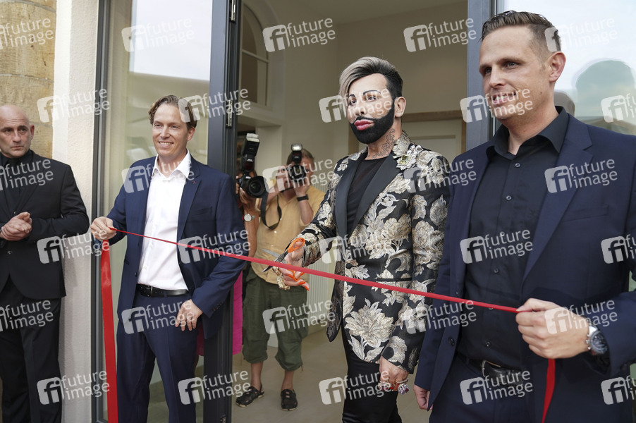 Harald Glööckler mit den Betreibern Bernd und Jochen Frey beim Pre-Opening des ersten Café Pompöös im Kurpark. Bad Dürkheim, 28.08.2019