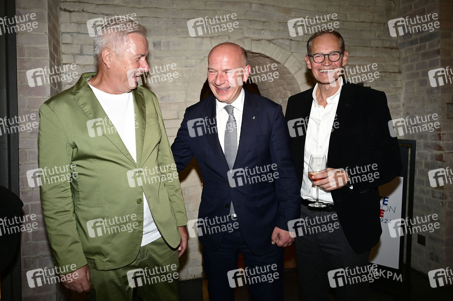 Klaus Wowereit, Kai Wegner und Michael Müller beim Flying Dinner zum 261. Geburtstag der Königlichen Porzellan-Manufaktur Berlin sowie der Enthüllung des vollständig, restaurierten Fliesenwandgemäldes 'Glory of Germania' in der Ringkammerofenhalle auf dem Manufakturgelände. Berlin, 20.09.2024