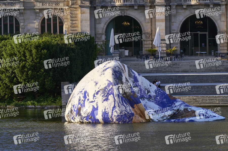 Einen Tag vor der Eröffnung der KunstFestSpiele Herrenhausen haben starke Windböen die Kunstinstalltion Floating Earth (schwimmende Weltkugel) des britsichen Künstlers Luke Jerram auf dem Maschteich so stark gedrekt das Wasser in die Luftkammern gelaufen ist. Mitglieder des DLRG haben vom Boot aus die verbliebene Luft aus der Kugel gedrückt und versuchen das Wasser aus der Kunstinstallation zu pumpen, damit Floting Earth zur Eröffnung am 16.Mai 2024 wieder beleuchtet und ausgestellt werden kann. Hannover, 15.05.2024