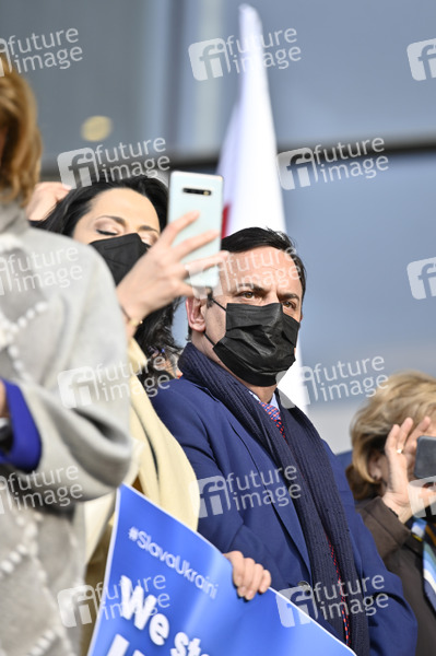 EU-Parlamentarier und Hunderte von Menschen demonstrieren vor dem Europäischen Parlament, um ihre Unterstützung für das ukrainische Volk zu zeigen, darunter Dutzende von in Belgien lebenden Ukrainern. Die Präsidentin des Europäischen Parlaments, Roberta Metsola, hält in Begleitung von Abgeordneten eine Rede vor den Anwesenden, in der sie die Unterstützung der Europäischen Union für die Ukraine deutlich macht und den Antrag der Ukraine auf EU-Mitgliedschaft begrüßt. Brüssel, 01.03.2022