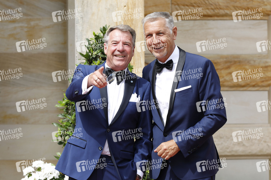 Patrick Lindner mit Ehemann Peter Schäfer bei der Eröffnung der 112. Richard-Wagner-Festspiele 2024 mit der Neuinszenierung von 'Tristan und Isolde' im Bayreuther Festspielhaus. Bayreuth, 25.07.2024
