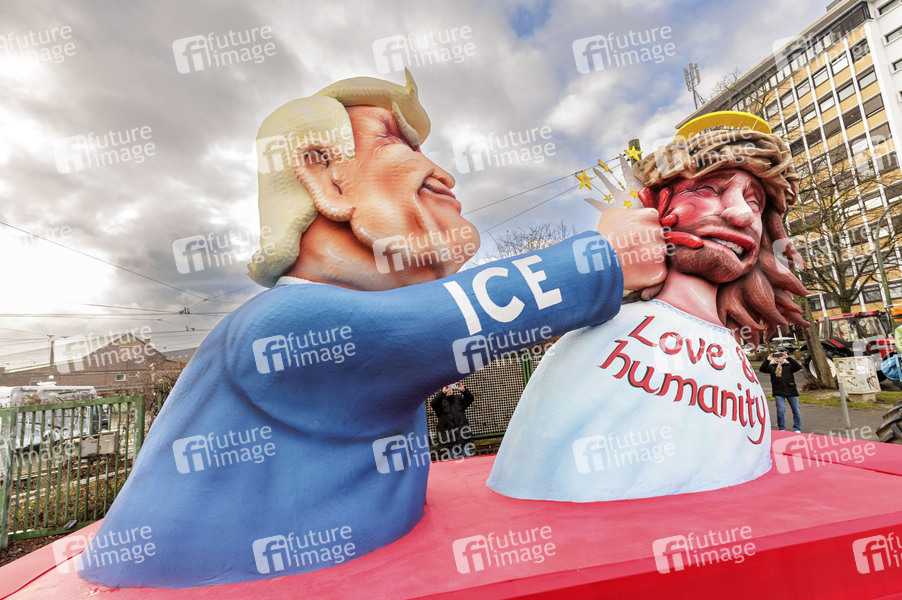 Motto-Wagen des Wagenbau-Künstlers Jacques Tilly bei der Aufstellung des Rosenmontag-Zuges an der Wagenbauhalle. Düsseldorf, 16.02.2026
