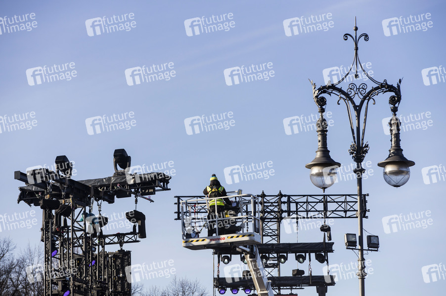 Vorbereitungen und Absperrungen zur jährlichen Silvesterfeier am Brandenburger Tor. Aufgrund der COVID-19-Abstandsregeln findet die Feier dieses Jahr nur als Fernsehübertragung ohne Livepublikum statt. Berlin, 30.12.2020